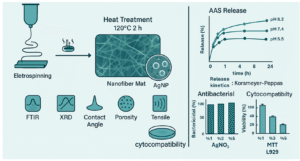 In recent years, the development of smart wound dressings with controlled drug release and antibacterial properties has attracted significant attention, particularly for the treatment of chronic and infected wounds. In this study, a wound dressing based on the Eudragit® L100-55 copolymer combined with chitosan and polycaprolactone (PCL) was fabricated and synthesized. The dressing was prepared using the uniaxial electrospinning method, and during the process, silver nanoparticles (AgNPs) were generated in situ from silver nitrate under thermal treatment within the polymeric matrix. This approach resulted in uniform fibers with suitable morphology and a homogeneous distribution of nanoparticles throughout the polymer network.